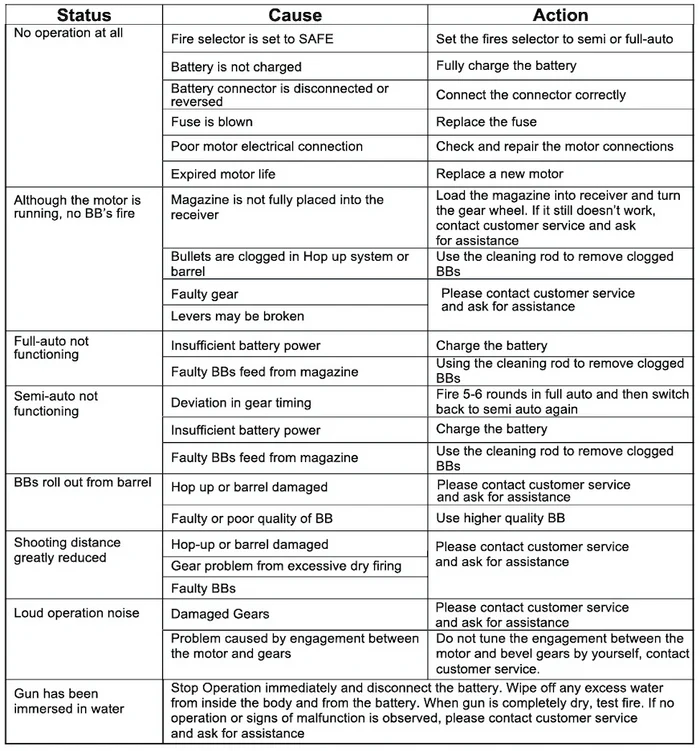 - Gear jams can occur due to firing with a weak or undercharged battery or storing the gun with the gears partially cycled.